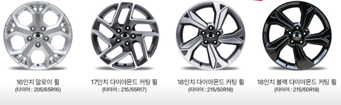 트림에 따라 16인치 알로이 휠과 17인치 다이아몬드 커팅일이 기본 적용됩니다. 바디 컬러는 토레스에서 가장 많은 인기가 있었던 아이언 메탈 컬러를 추가해 원통 컬러 5가지 투톤 컬러 5가지 등 총 10가지의 바디 컬러를 자신의 취향에 맞게 선택할 수 있습니다.