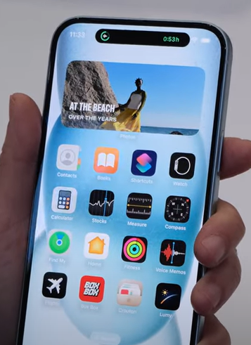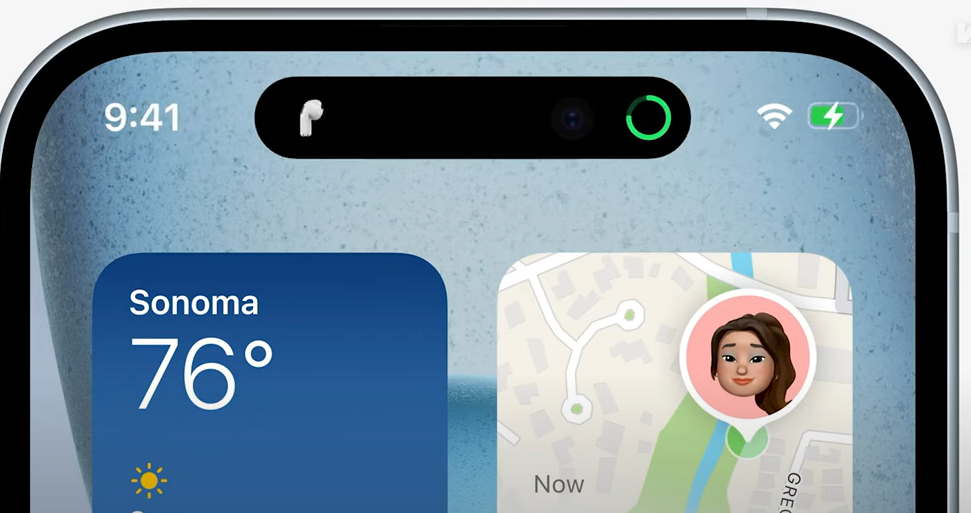 실제로 만져보니까 조약돌같이 매끈한 느낌의 포근한 컬러감이 들어서 깔끔하고 은은한 느낌이 들었습니다. 전면에는 지난 시리즈 프로라인에 적용된 다이내믹 아일랜드가 일반 라인업에도 이제 적용돼서 노치와 다른 화면 디자인을 갖게 됩니다.