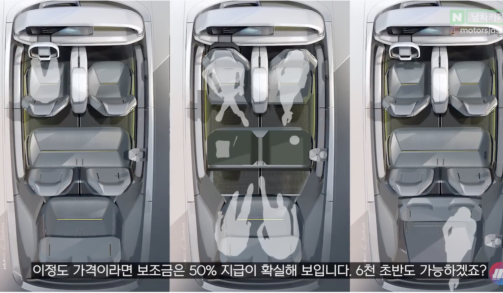 트렁크 부위 램프는 위장막에 가려졌지만 콘셉트카를 재현했다는 걸 알기에 세로로 긴 기하학적 형태를 기대할 수 있습니다. 이밖에 리어 서스펜션 알루미늄 소재까지 볼 수 있네요. 다음은 실내입니다 실내는 아직 스파이샷이 없지만 기아는 지난 인베스터 데이에서 몇 가지를 공개했는데요 실내 디스플레이는 무려 27인치 울트라 와이드 디스플레이 가 탑재되며 새로운 스페이스 이노베이션 개념이 적용됩니다. 실내 구성의 변경을 의미하는 것으로 기아가 공개한 개념도 에선 시트가 서로 마주한 걸 볼 수 있습니다.