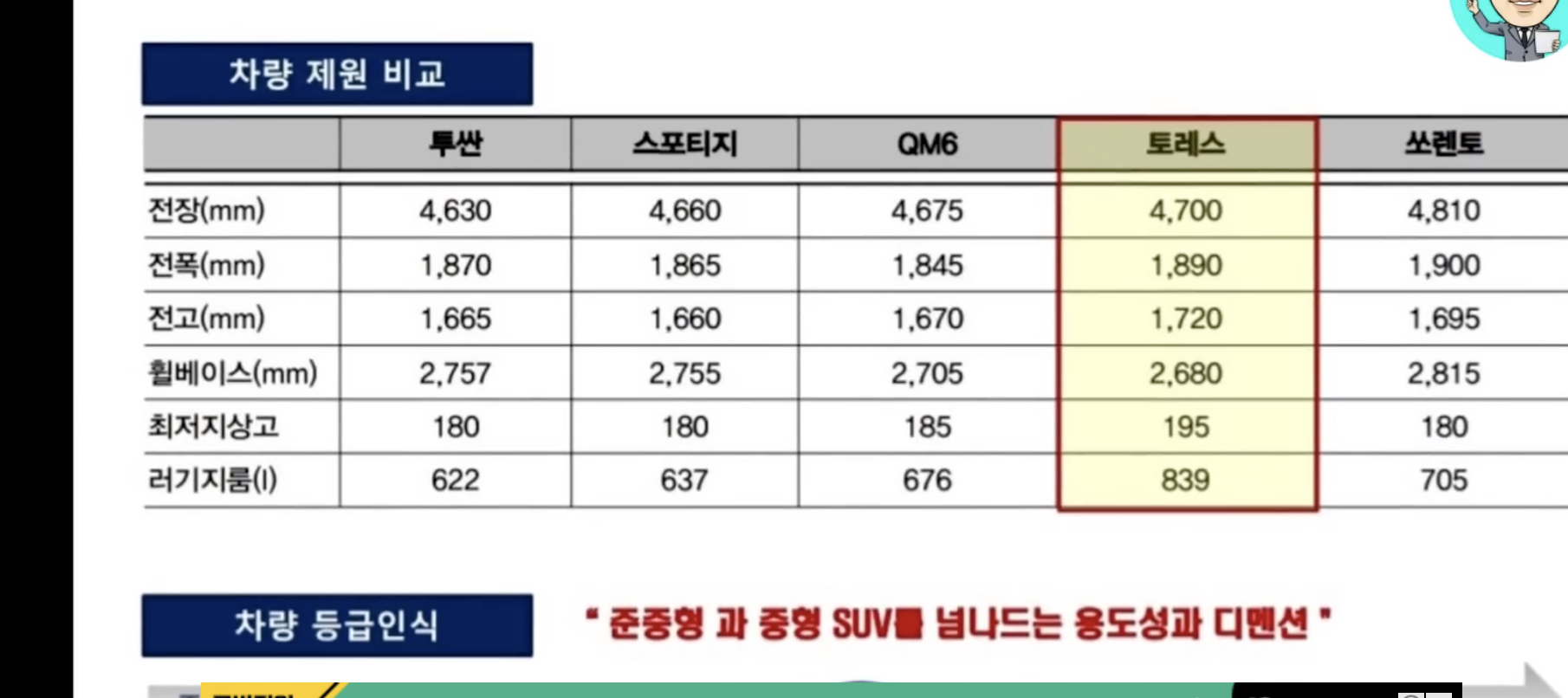 출시 전에 좀 작을 거라 예상했던 토레스의 크기는 예측을 완전히 벗어났습니다. 다른 건 몰라도 경쟁 차량인 투싼이나 스포티지보다 좀 더 크고 심지어는 QM6 보다도 큰 전장으로 출시되고 가격마저도 경쟁 차량 보다 좋아 소비자들의 관심을 받기에 충분한 조건을 갖추고 있습니다.