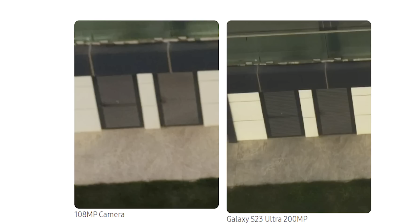 건물의 배치되어 있는 환풍구 같은 건지 문인지는 모르겠지만 표면에 검은 그릴이 있는 것이 보이죠 더 말할 필요도 없이 우측 갤럭시S23의 울트라의 2억 화살로 찍은 사진이 환풍구에 그릴은 물론 주변 바닥의 텍스처가 훨씬 선명하게 나타납니다.이번 사진만 보면 1억 800만 화소에서 2억 화소로 업그레이드된 가치 된 가지는 것으로 보입니다. 일단 사진을 더 선명하게 찍을 수 있는 것은 확실히 확인되었습니다.