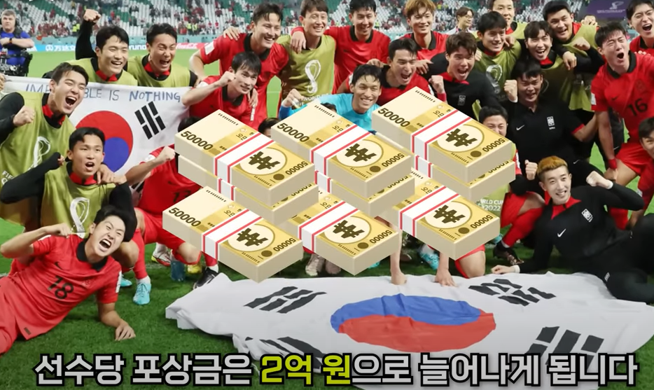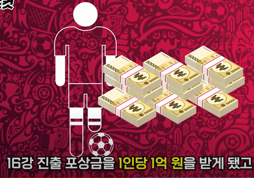 다음은 포상금입니다 16강 진출 포상금을 1인당 1억 원을 받게 됐고 16강 상대인 브라질을 이기면 선수당 포상금은 2억 원으로 늘어나게 됩니다.