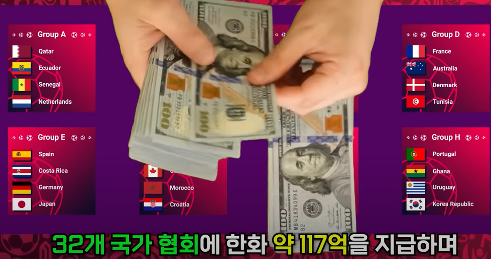 그리고 본선에 진출한 서른두 개 국가 협회에 한화 약 117억을 지급하며 오른 국가의 협회에 대해서는 약 170억을 지급하고 만약 8강 진출 시에는 약 220으로 포상금이 늘어나게 됩니다.