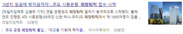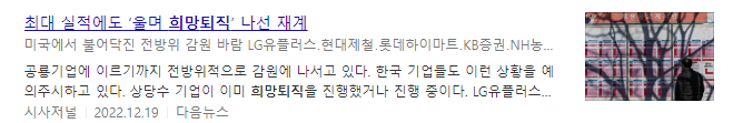 희망퇴직의 칼바람이 불고 있습니다. 누군가에게는 기회가 누군가에게는 커다란 걱정이 될 수 있는 희망퇴직. 힘든 이 시기 회사와 직장인들 모두에게 득이 될 수 있는 그러한 상생하는 희망퇴직이 진행이 되어야 하겠습니다.