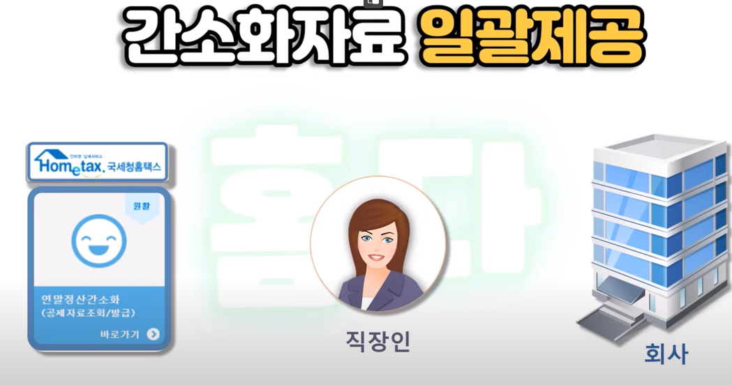 기존에는 직원이 본인의 간소화자료를 홈택스에서 출력해서 이 출력물을 회사에 다시 제출 했어야만 했지만 이제는 일괄제공 서비스를 이용하면 국세청이 내 간소화자료를 회사로 바로 제공해 주기 때문에 직원인 내가 간소화자료를 출력해서 제출할 필요가 없어지게 된 겁니다.