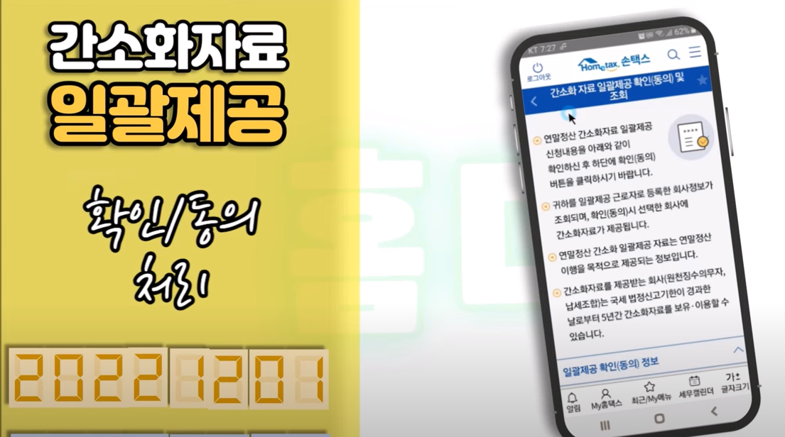 회사에서 홈택스에 일괄제공 대상자로 등록을 했더라도 직원 본인이 이 확인 동의 처리를 하지 않으면 간소화자료가 회사로 일괄제공 되지 않게 되니까요 연말정산을 할 직원은 꼭 한번은 이 확인 과정을 거쳐야 합니다. 다만 작년 연말정산 때 일괄제공 확인 동의 처리를 이미 했었던 분들은 이 확인 과정을 또다시 할 필요는 없습니다.