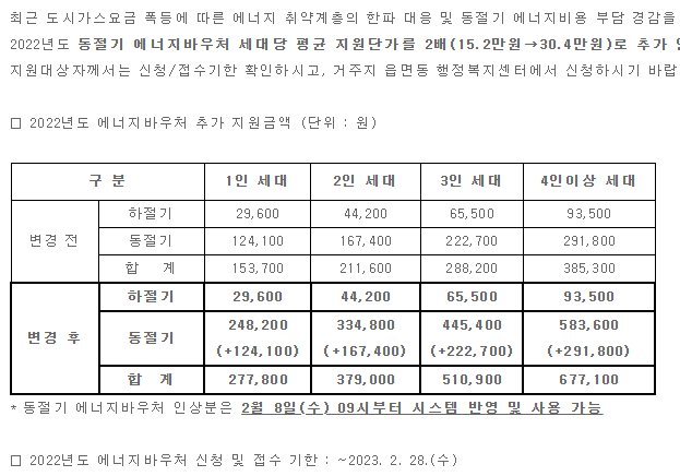 에너지바우처를 받지 못하는 차상위 계층에는 기존 가스요금 할인으로 지원받는 14만4천원에 더해 44만 8천 원의 가스요금을 추가로 할인을 받을 수 있다고 합니다. 그리고 에너지바우처를 받지 못하는 기초생활수급자 가운데 생계·의료급여형 수급자에게는 기존 가스요금 할인으로 지원받는 28만 8천 원에 더해 30만 4천 원을 추가로 지원하기로 하였습니다.