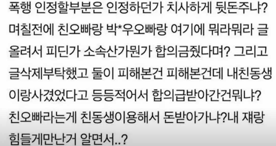 이어 그녀는 불타는 트롯의 제작진이 이미 자신의 친오빠에게 합의금을 전달했다며 피해 본 건 난데 친오빠라는 게 친동생 이용해서 돈 받아가냐 아는 충격적인 사실까지 밝혔습니다.