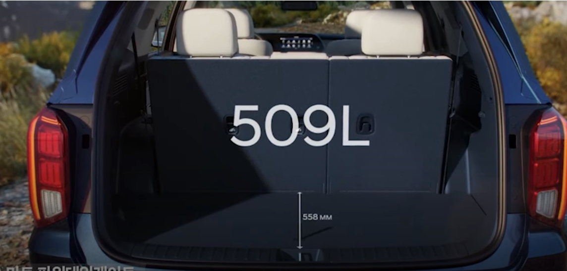대형 SUV 팰리세이드 3열 뒤에 공간은 길이가 558mm의 509 리터 dml 적재 용량을 자랑했는데요 하지만 딱 봐도 실내 정보를 포함해서 이열 공간은 큰 차이를 보이는데 팰리세이드보다 한 1.5에서 2배 정도의 적재 공간을 자랑할 것 같습니다.