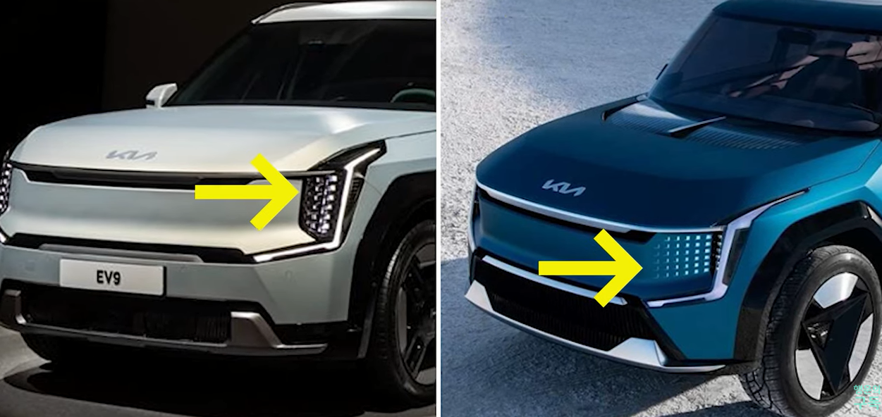 그럼 디자인을 비교해 볼게요 전면부 디자인의 핵심역할을 하는 헤드램프는 형태를 유지하고 있지만 두 가지가 달라졌는데요 첫 번째는 시퀀셜 램프처럼 그릴 안쪽으로 작동했던 램프는 양산차에서는 기대하기 힘들 것 같고요 공개된 차량을 보면 투영이 되는 플라스틱이 아닌 일반 플라스틱 재질로 변경된 거 같은데 그래서 세 줄에 수직형 헤드램프로 디자인이 조금 달라졌습니다.