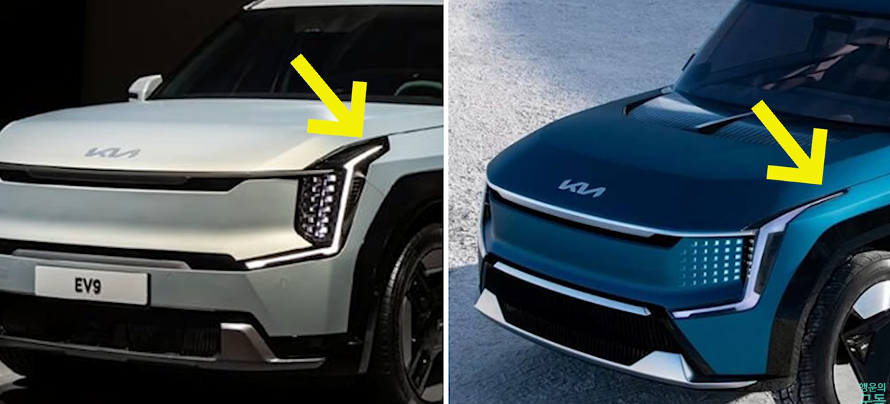 공개된 차량의 디자인은 이렇게 생겼습니다. 수직으로 뚝 떨어지는 강렬한 느낌의 헤드램프의 디자인은 EV9의 새로운 디자인의 결정체라고 할 수 있을 것 같습니다.