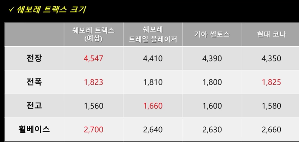 전고의 경우 완전한 suv가 아닌 크로스오버 장르이기 때문에 4개의 모델 중에서는 가장 낮은 높이를 가진 것이 특징이고요 휠베이스는 놀랍게도 가장 넓은 공간을 제공합니다. 뭐 이렇게 되면 트랙스에 대한 호감이 상당히 올라가는데요 3월 22일 트랙스 론칭 행사 때 제가 직접 타보고 2열 공간에 대한 크기 역시나 여러분들께 전달드리도록 하겠습니다.