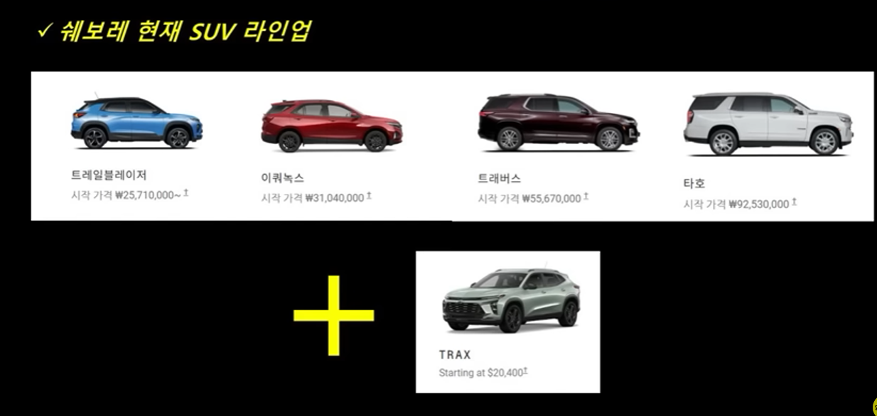 현재 쉐보레는 국내에서 총 4가지의 SUV 라인업을 판매 중인데요 트레일블레이저를 시작으로 이쿼녹스, 트래버스 그리고 풀사이즈 SUV인 타호를 판매하고 있습니다. 트랙스가 출시되면 트레일블레이저 밑으로 즉 막내 SUV 라인업으로 자리 잡게 되죠 경쟁 모델로는 기아 셀토스나 현대 코나 정도를 꼽을 수 있겠죠.. 가장 인기가 많은 콤팩트 SUV 라인이 하나 더 추가되는 겁니다.