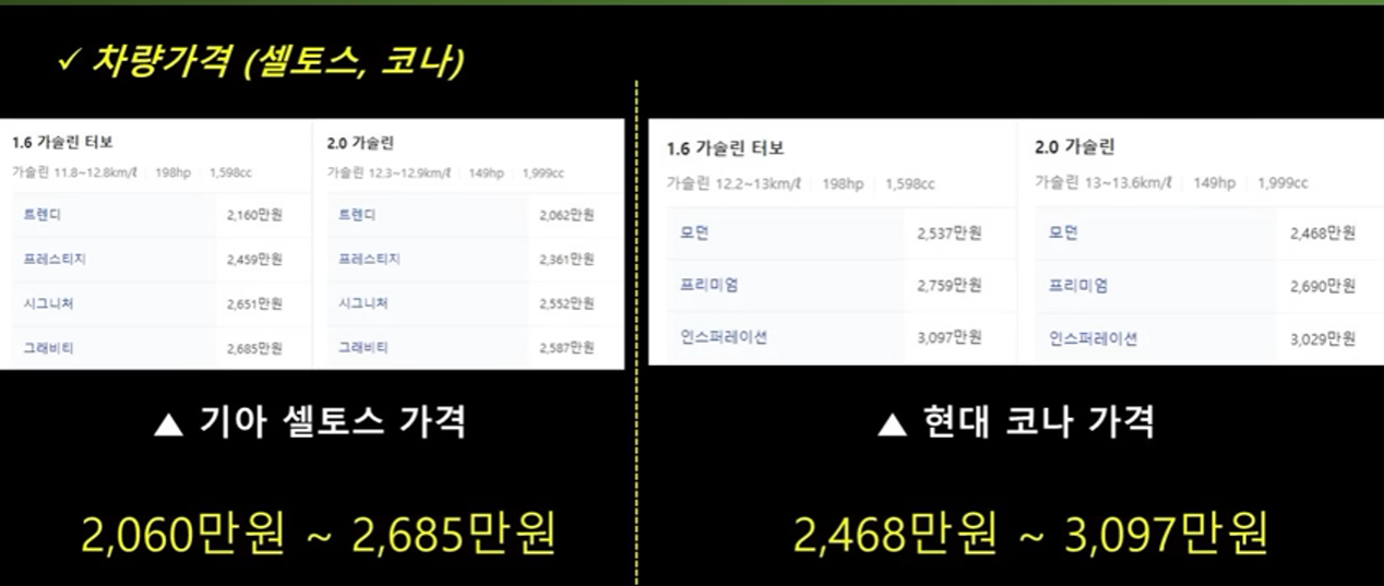 그리고 가장 중요한 가격을 살펴보도록 하겠습니다. 기아 셀토스는 2060만 원부터 시작해서 2685만 원 범위의 형성되어 있고 여기에 옵션을 더 추가하면 금액이 더 올라가겠죠 현대 코나는 2468만 원부터 시작해서 3,097만 원 범위 형성되어 있고 이번에 풀체인지가 되면서 전체적으로 금액이 많이 상승했습니다.