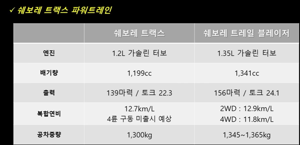 그 결과 트랙스는 139마력의 토크 22.3을 발휘하고요 트레일 블레이저는 156마력의 토크 24.1을 발휘하죠 토크 부분에서는 그렇게 큰 차이가 나진 않습니다.