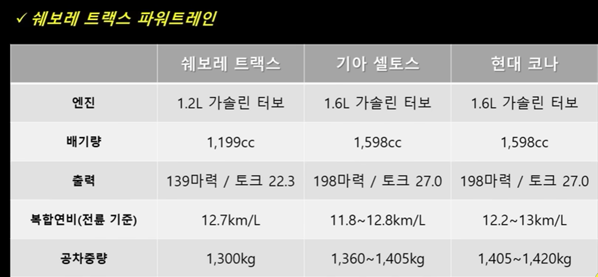 물론 스펙적으로 셀토스와 코나가 좀 더 높긴 하지만요 크기적으로 봤을 때는 트랙스가 메리트를 가지고 있고 뭐 디자인적인 차이도 있기 때문에 엔진 스펙은 상대적으로 낮지만 충분히 경쟁을 해 볼만하다고 생각이 됩니다.